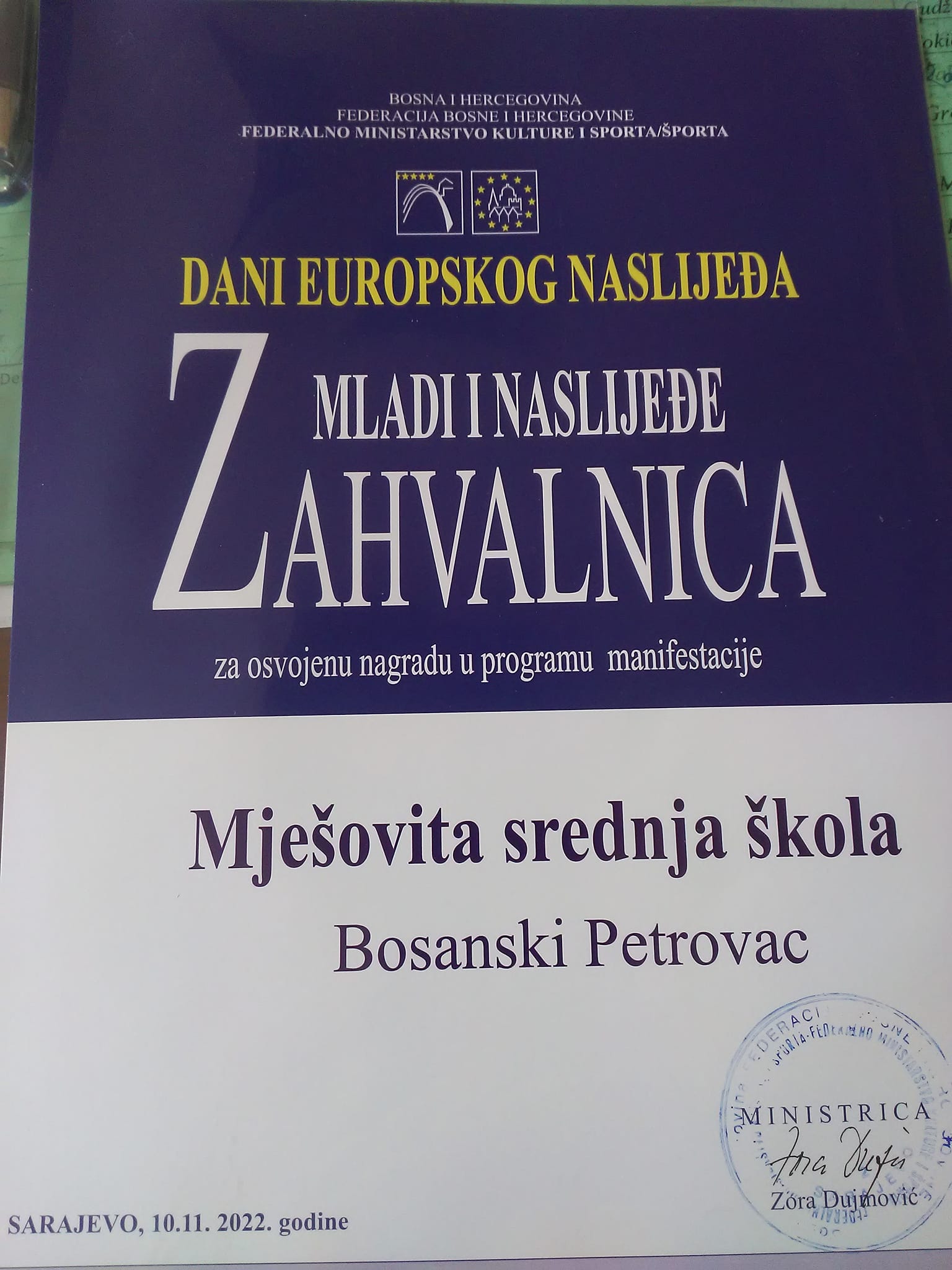 Učenici naše škole Anđelina Atlagić, Kovačević Ivana, Ćurguz Dragoljub i Gutlić Tarik uz mentorstvo prof. Balić Gordane osvojili su treće mjesto na konkursu Mladi i naslijeđe”Održiva kulturna baština- tradicija, budućnost i mladi” Federalnog ministarstva kulture i sporta u kategoriji video rad. Naziv rada je “Naš slikar Jovan Bijelić kao inspiracija”.