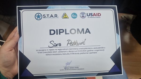 STAR CHALLENGE 2024. god sjajan uspjeh Posted on March 18, 2024 7:22 am by Nedret Comment Odlične vijesti stižu iz Banja Luke (14.3.2024.god). Danas je održano regionalno takmičenje srednjoškolaca u poduzetništvu STAR CHALLENGE 2024. Učenica IV razreda ekonomske škole Sara Petković je zauzela 3 mjesto. Čestitamo 📂This entry was posted in Aktuelnosti